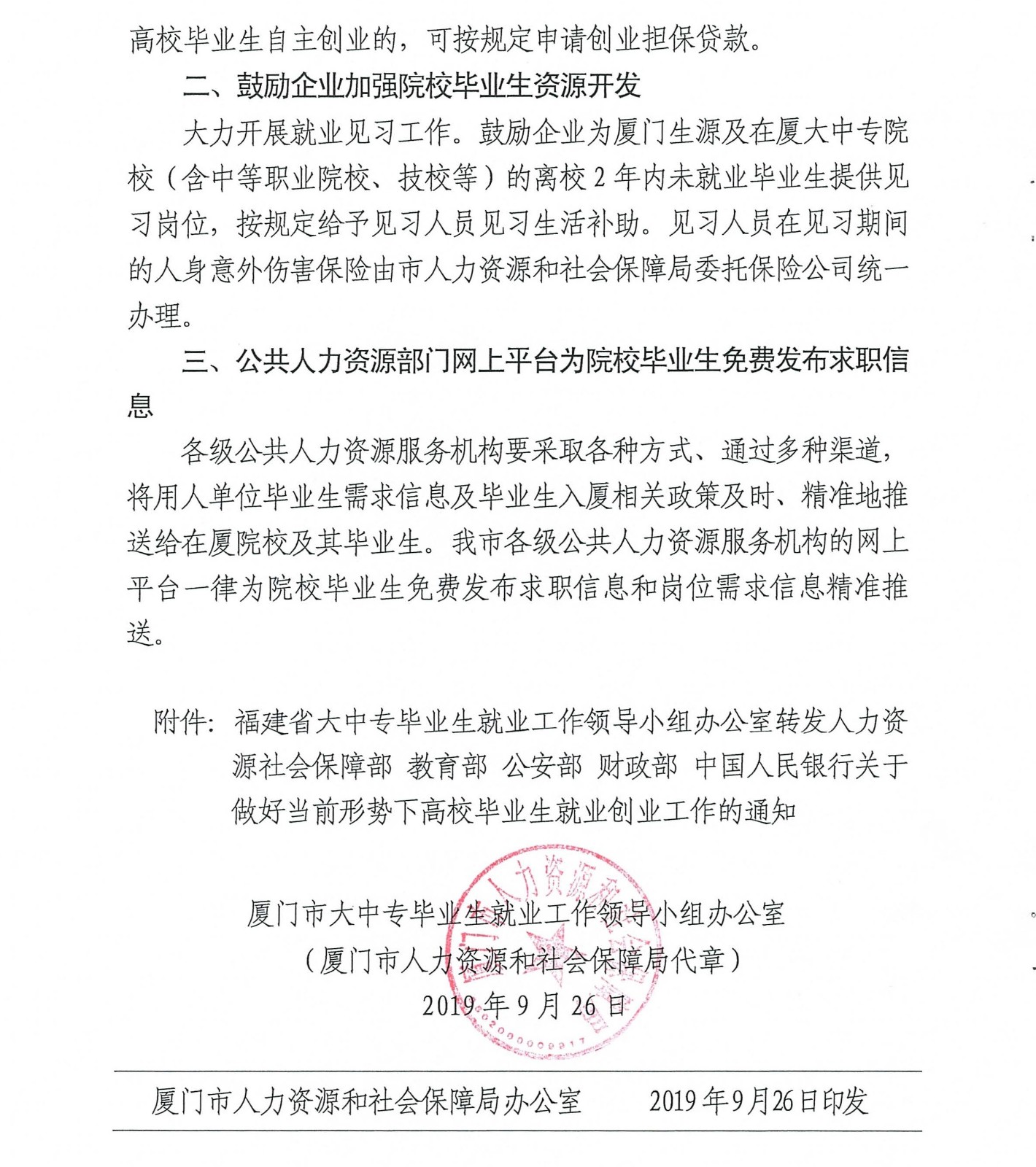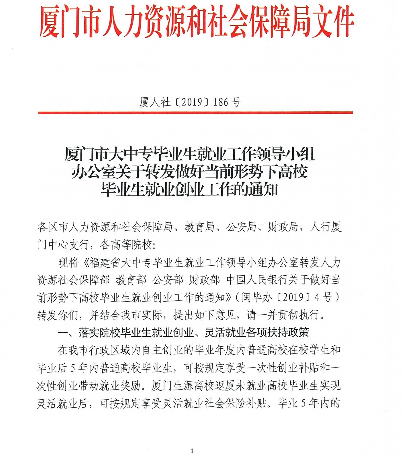 厦门市人力资源和社会保障局做好当前形势下高校毕业生就业创业工作的通知