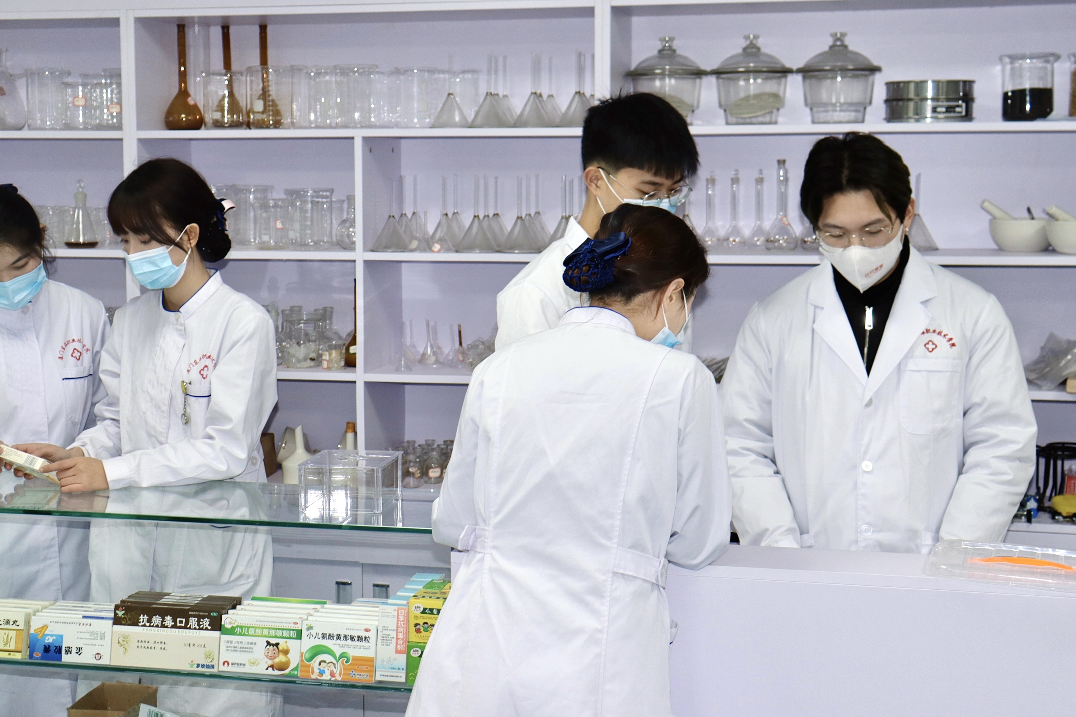 主要实训项目:显微操作与技术、模拟药品经营与管理、精细天平秤量训练、中药饮片识别、中药调剂、酸碱滴定操作、萃取与提纯、药品的认识、分类、摆放等技能实训操作。