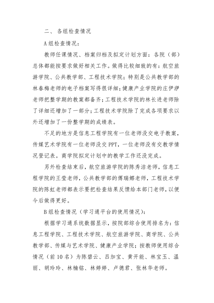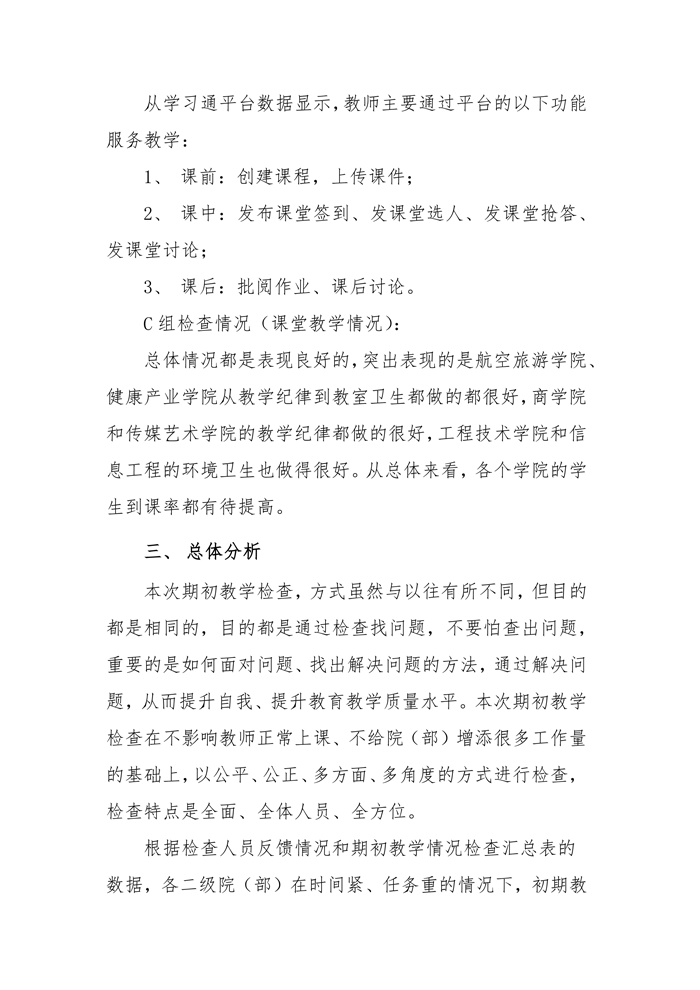 本次期初教学检查,方式虽然与以往有所不同,但目的都是相同的,目的都是通过检查找问题,不要怕查出问题,重要的是如何面对问题、找出解决问题的方法,通过解决问题,从而提升自我、提升教育教学质量水平。本次期初教学检查在不影响教师正常上课、不给院(部)增添很多工作量的基础上,以公平、公正、多方面、多角度的方式进行检查,检查特点是全面、全体人员、全方位。