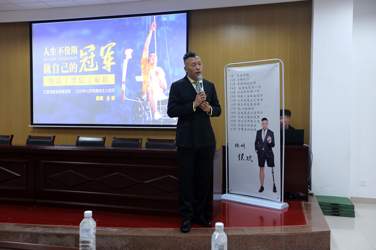侯斌先生,世界残奥会三届男子跳高金牌得主,残奥会跳高世界纪录保持者,国际残奥委会残奥形象大使,曾与全球18位总统同台演讲。