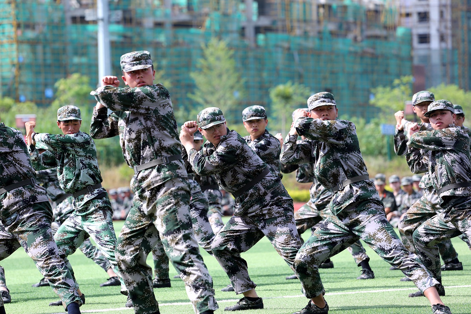 接着,由男生组成的十六连队伍为我们带来擒敌拳表演,一招一式,刚劲有力,加上气势如虹的口号声,把现场氛围推向高潮。