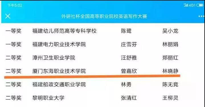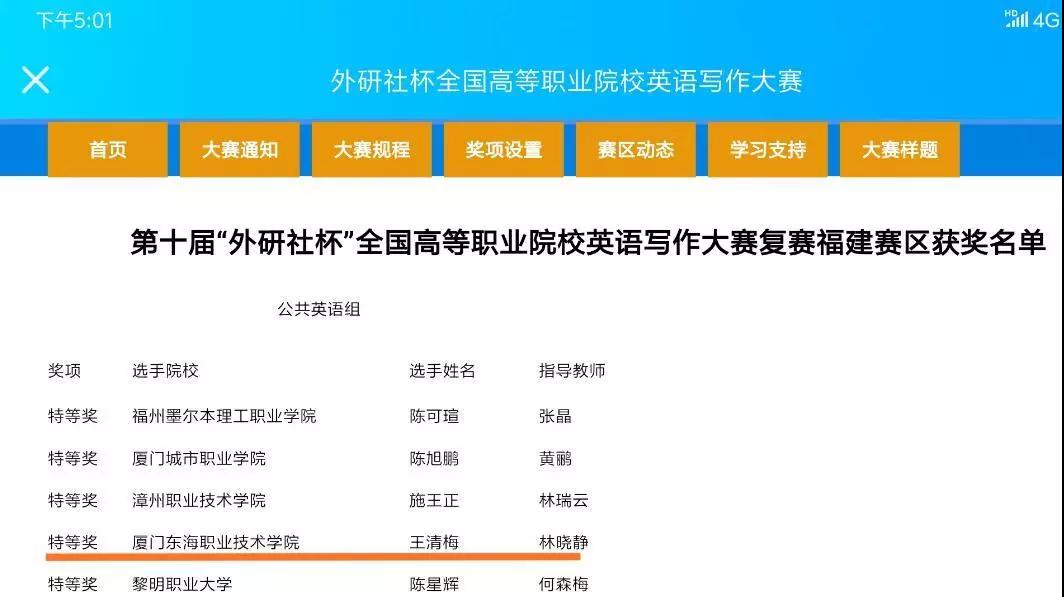 添加时间:2019-10-2510月20日,第十届“外研社杯”全国高职高专英语写作大赛福建省复赛在黎明职业大学举行,永利官网王清梅、曾嘉欣两位同学在林晓静老师的指导下,与来自省内其余21所高职院校的50多位选手角逐,最终,王清梅同学斩获特等奖,获得参加本届“外研社杯”国赛资格,曾嘉欣同学斩获二等奖,可喜可贺。