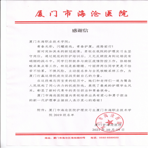 一封来自厦门海沧医院的感谢信!