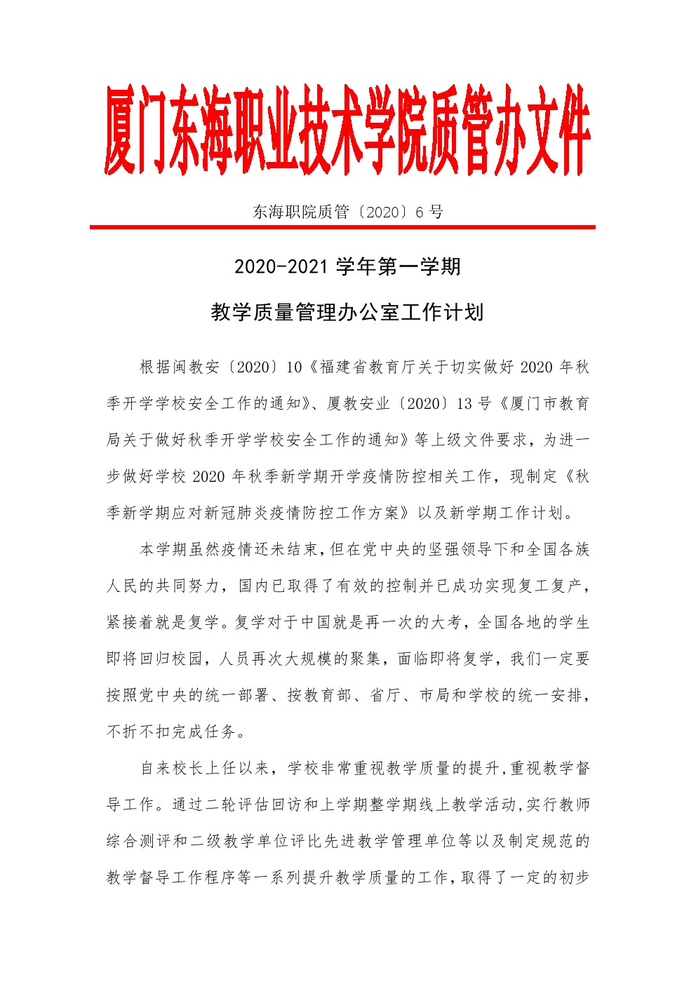 东海职院质管〔2020〕6号 2020-2021学年第一学期教学质量管理办公室工作计划