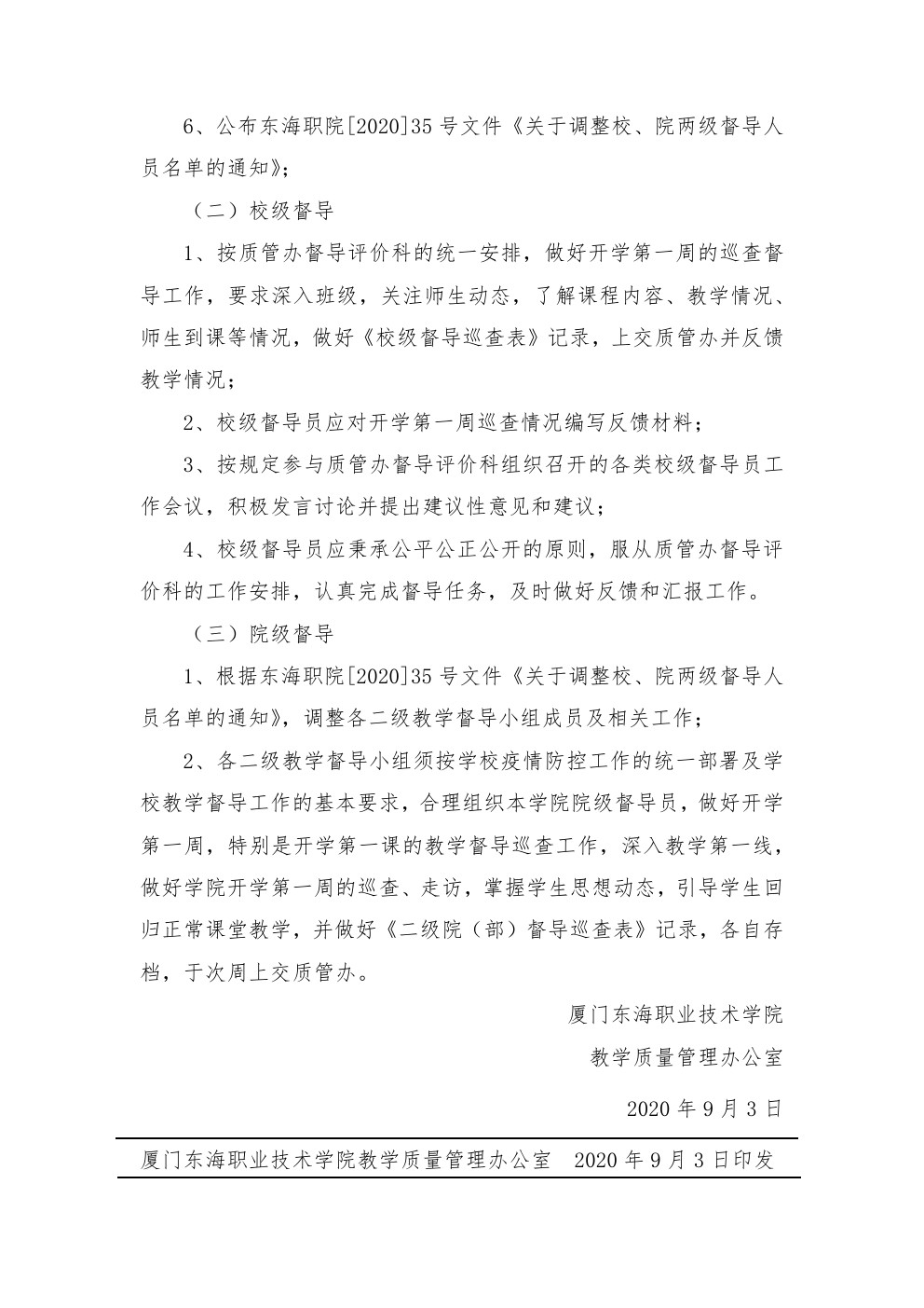 东海职院质管〔2020〕7号 关于做好2020-2021学年第一学期开学第一周教学督导工作的通知