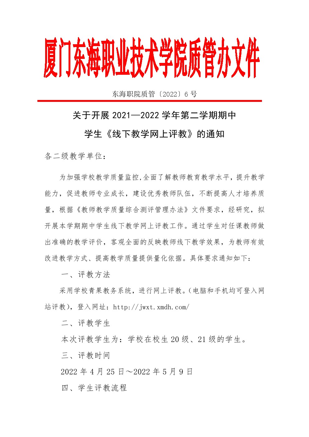 东海职院质管〔2022〕6号 关于开展2021-2022学年第二学期期中学生《线下教学网上评教》的通知