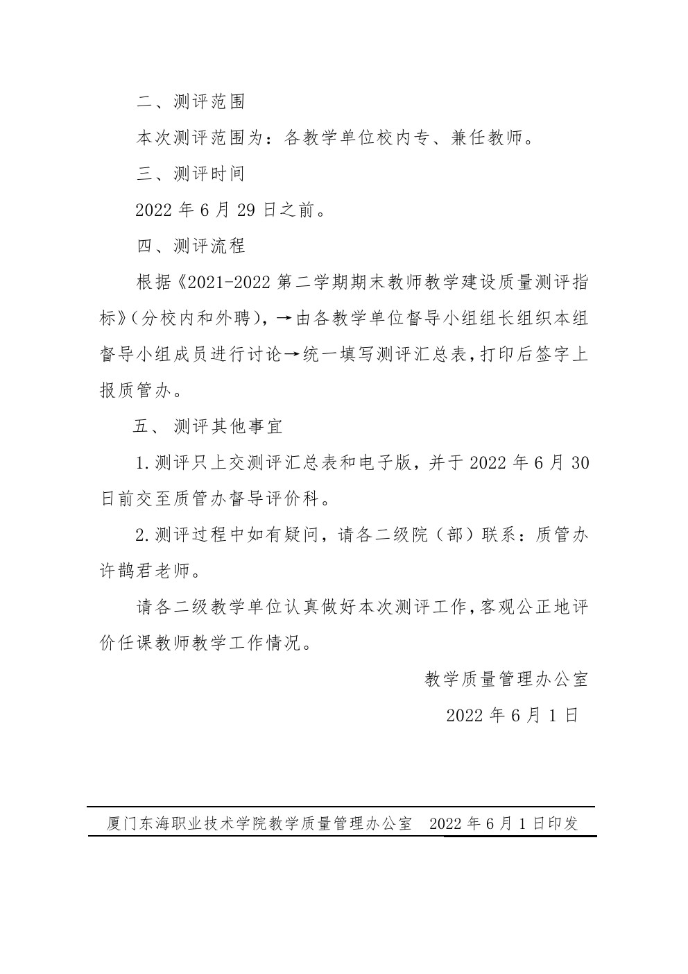 东海职院质管〔2022〕9号 关于开展2021—2022学年第二学期期末《教师教学建设质量测评》的通知