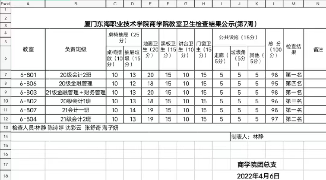 2021-2022年第二学期商学院第七周班级卫生评比