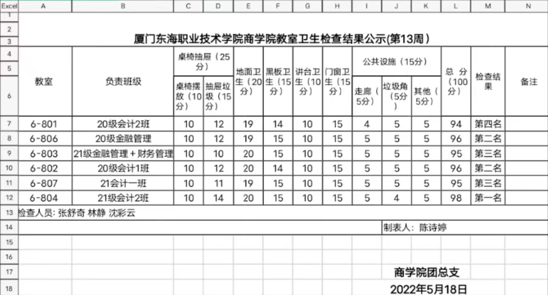 2021-2022年第二学期商学院第十三周班级卫生评比