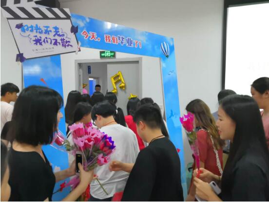 最后,全体师生合唱毕业歌“大学问”,并在商学院的全体老师欢送下离开象征毕业的门框,向他们说再见。
